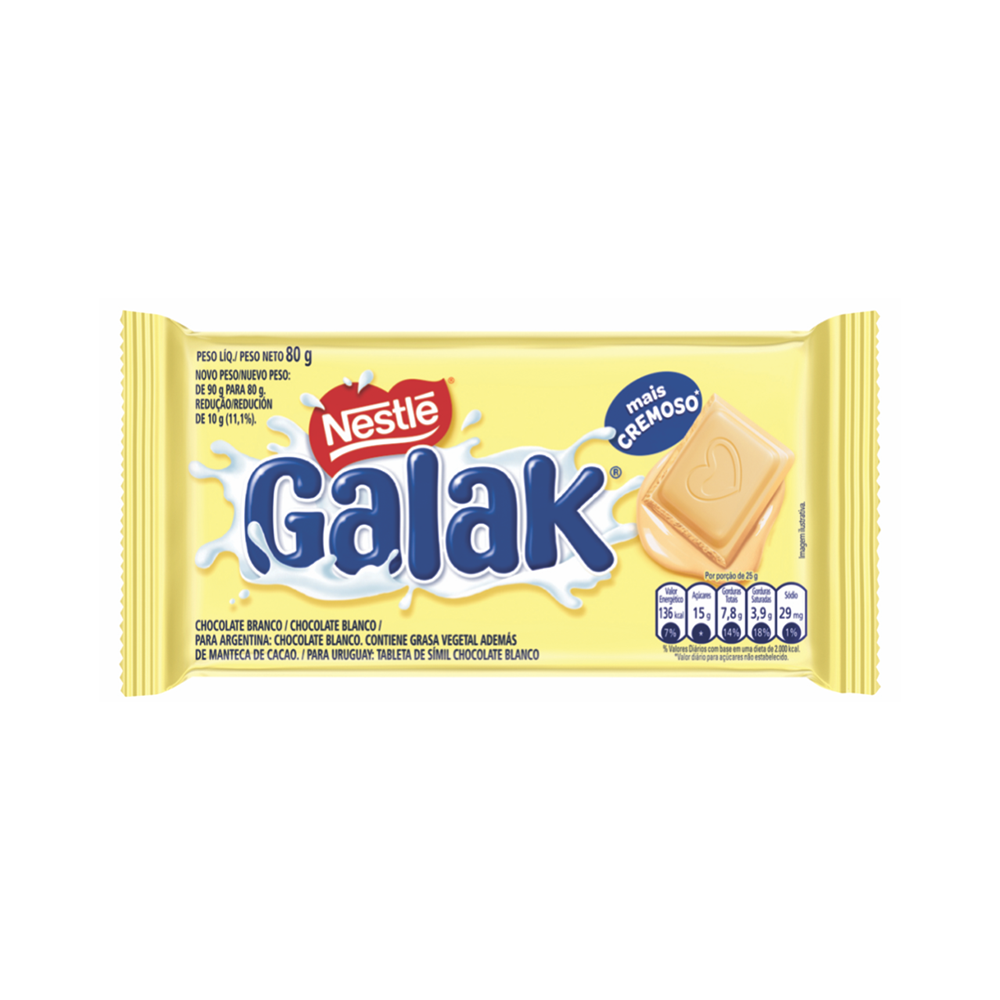 Com seu sabor único de chocolate branco e textura cremosa, o Galak Nestlé é uma delícia que agrada todas as idades. Cada barra de 80g é perfeita para compartilhar ou saborear aos poucos. Uma opção indulgente, doce na medida certa, e com aquele toque clássico da Nestlé.